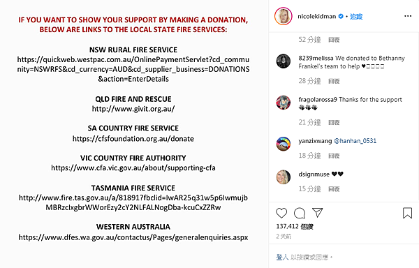 包括妮可基嫚Nicole Kidman、粉紅佳人也都紛紛發聲表示將會捐款至給澳洲當地消防單位,除了祈禱澳洲能夠趕快度過難關外,如果有餘力的人,也可捐款至以下單位,一起支持和關心澳洲受災情形。
