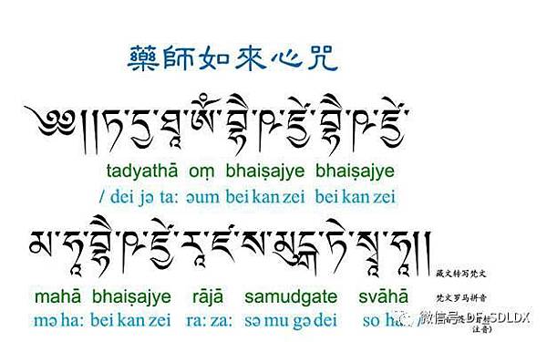 「歸依世尊藥師琉璃光如來、應供、等正覺,即說咒曰:嗡(咒語啟始)、藥!藥!藥!普遍救度一切眾生,圓滿成就!」